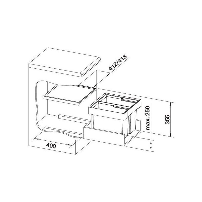 BANCO 521468 FLEXON II 45/2 Technické parametry: Je nutná skříňka se zásuvkou. - výška zabudování 355 mm od dna zásuvky, hloubka zabudování 400 mm - maximální výška rámu 250 mm od dna zásuvky - vhodný i pro skříňky s kazetovými dvířky s šířkou rámu od 90 mm - při plánování je třeba zohlednit, v jaké výši je zabudovaný odpad, výšku umístění dna zásuvky, hloubku zabudování dřezu s odtokovou armaturou a z toho vycházející minimální rozměr pro spodní skříňku - minimální doporučená výška soklíku pro zabudování Movex-u: 100 mm